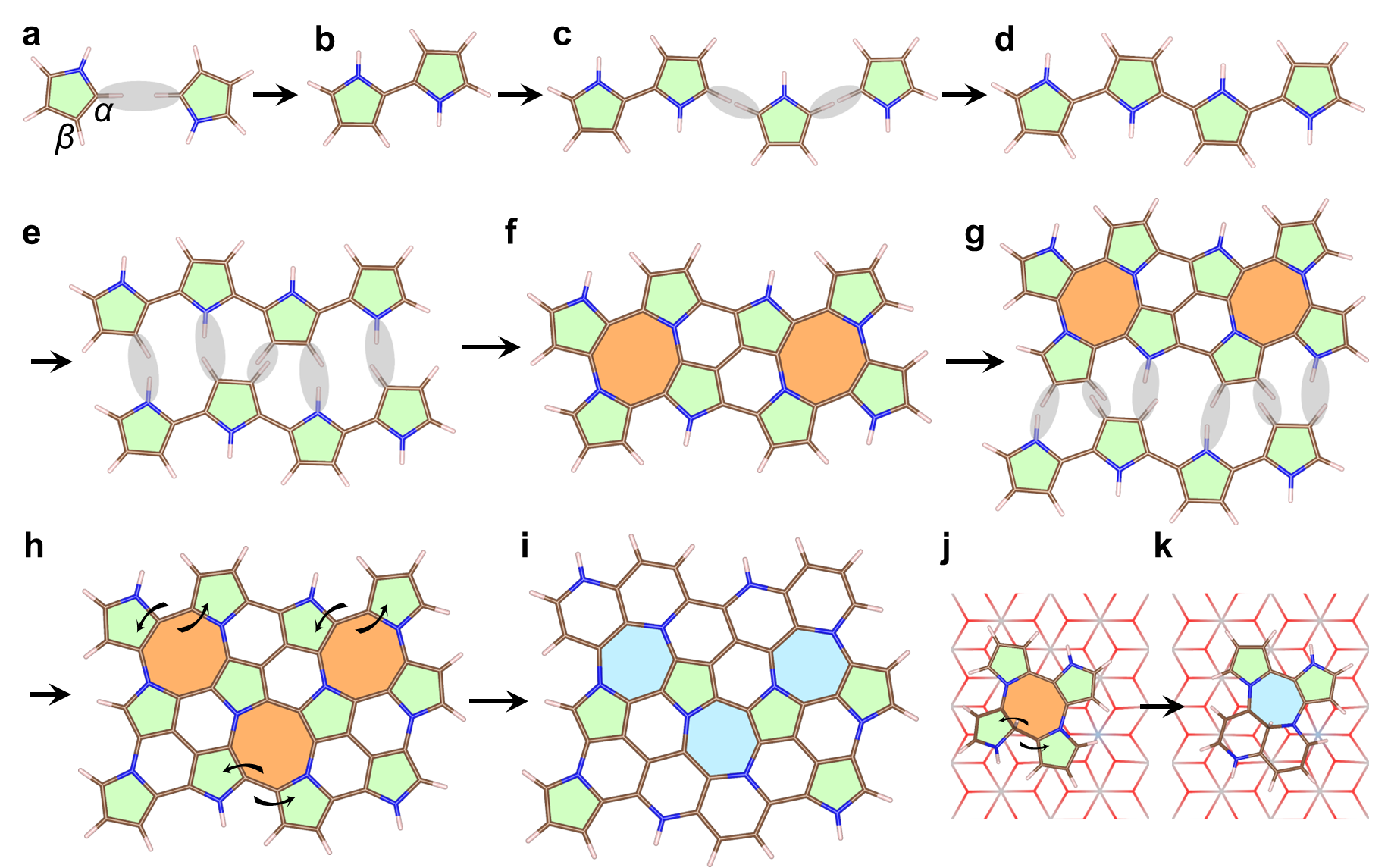 在这项研究中,由北京亚州怡红院郭林教授、刘利民教授研究团队及合作者等开创了一种全新的液相限域聚合方法。该方法通过层状模板的限域作用,抑制了分子聚合过程中的三维旋转和缠绕,使分子在二维平面内发生聚合,突破了吡咯单体在传统聚合中局限于α-C位点交联的限制,促进了β-C和N位点的交联聚合,构成平面网络结构,最终形成了五、六、七元环共存的二维非晶结构,成功在实验上验证了W. H. Zachariasen和Steven G. Louie提出的理论预测。